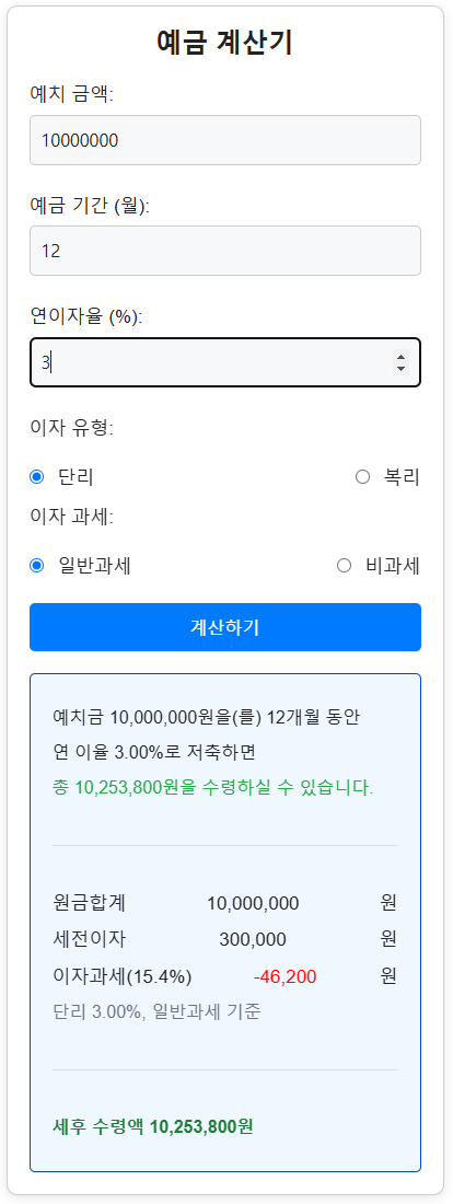 실제 예시를 통해 예금이자 계산기의 활용 방법을 알아보겠습니다.