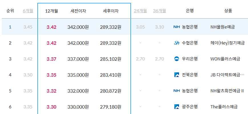 시중은행의 경우 금리가 다소 낮은 편입니다. 농협의 NH올원예금이 3.42%로 가장 높은 금리를 제공하며, 수협은행의 헤이 정기예금과 우리은행의 WON플러스예금도 3.42%와 3.37%의 금리를 제공합니다.