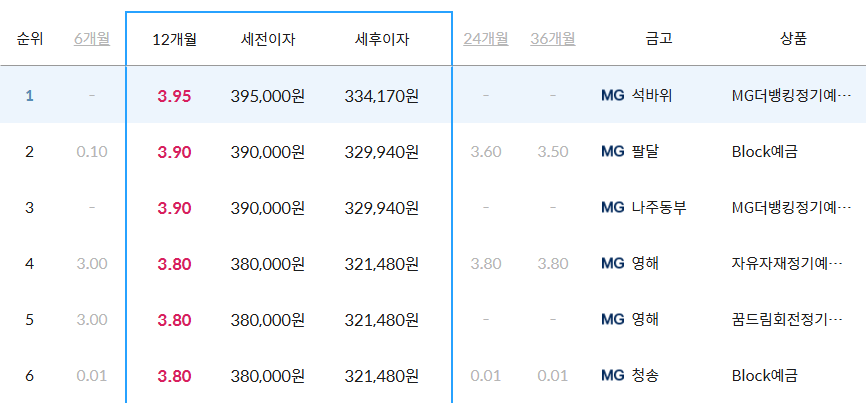 - MG더뱅킹정기예탁금 (MG새마을금고): 3.95%