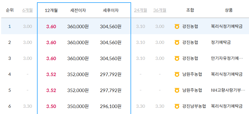 강진농협 복리식정기예탁금에 1천만 원을 예치할 경우, 세전 이자 360,000원, 세후 이자 304,560원의 이자를 받을 수 있습니다. 지역 농협은 본점과 지점의 금리가 다를 수 있어, 예금을 할 때는 가까운 지점에 문의하는 것이 좋습니다.